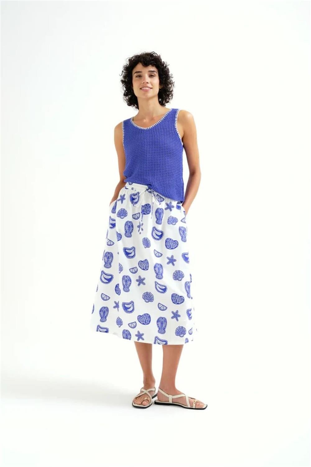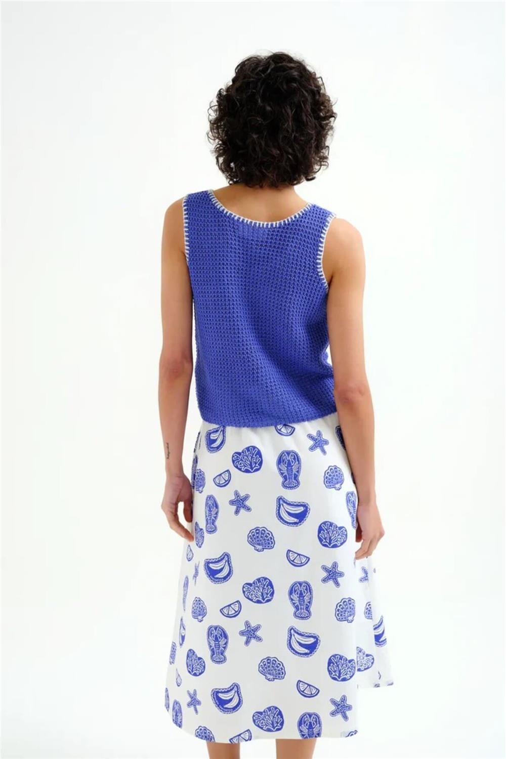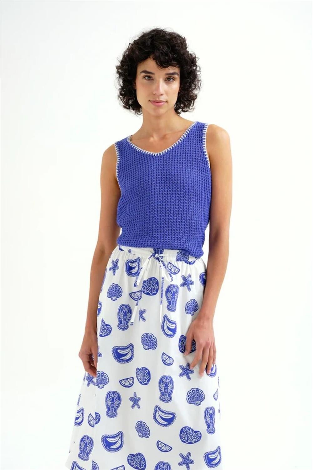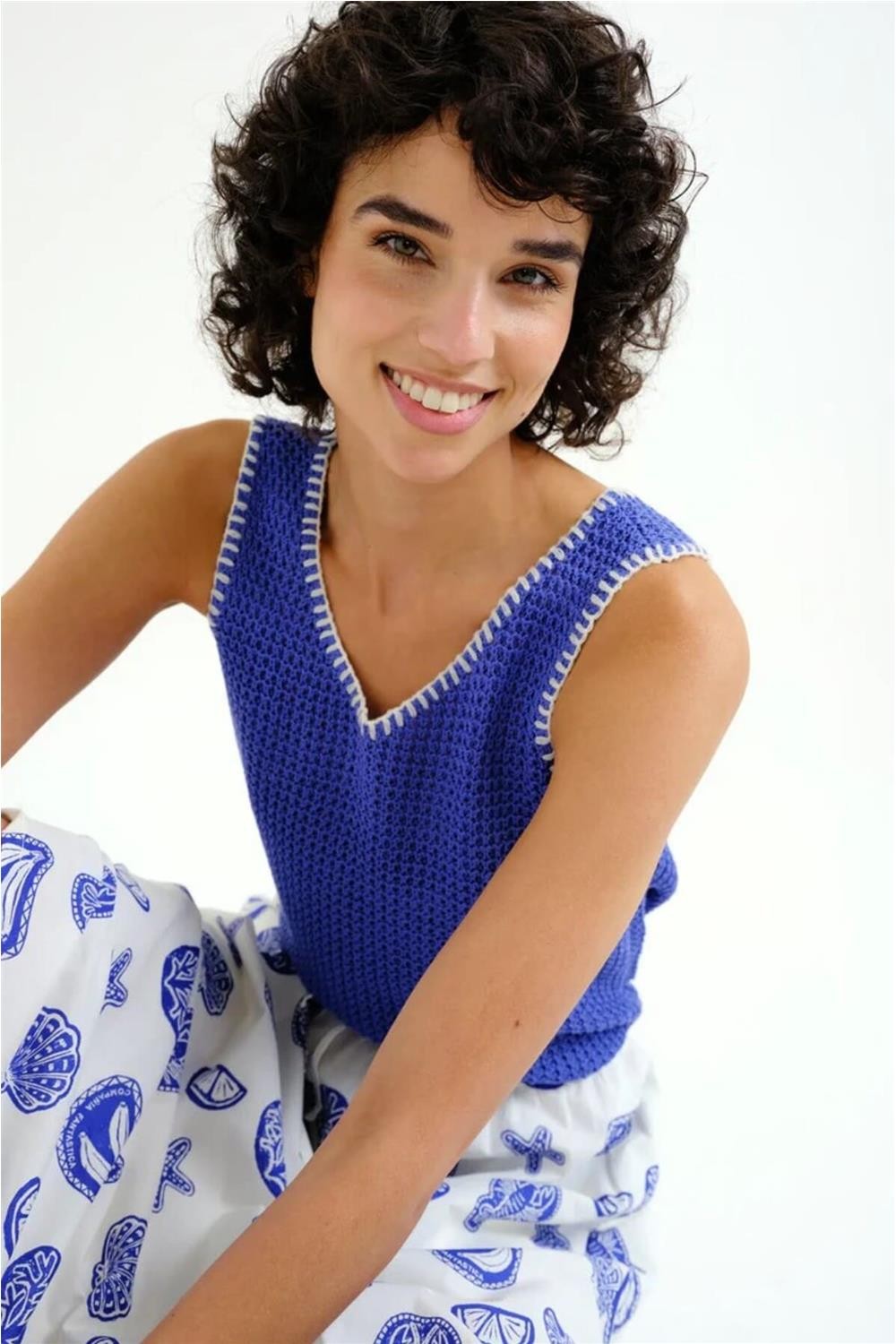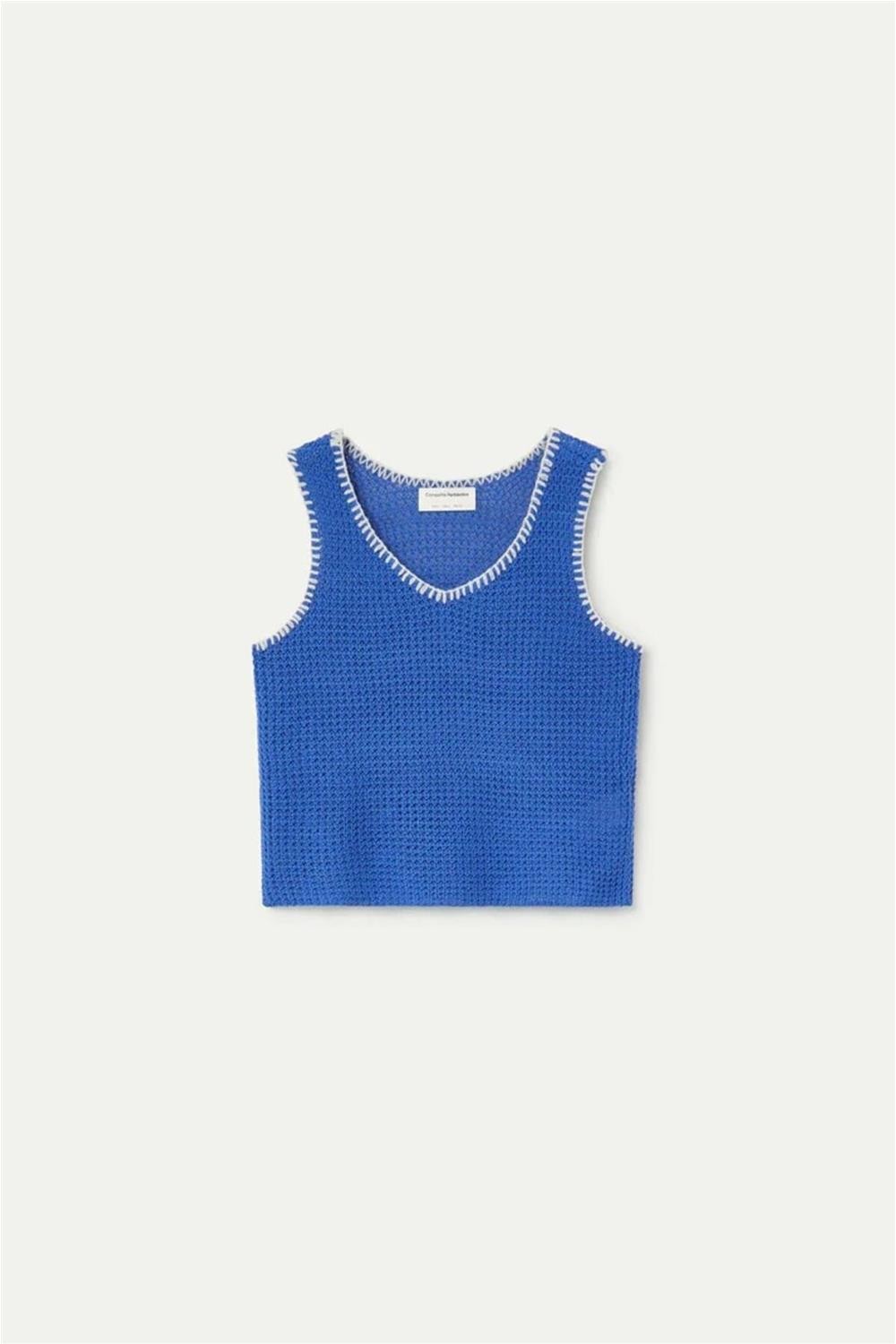 Top Compañía Fantástica punto calado azul con detalles bordados en blanco